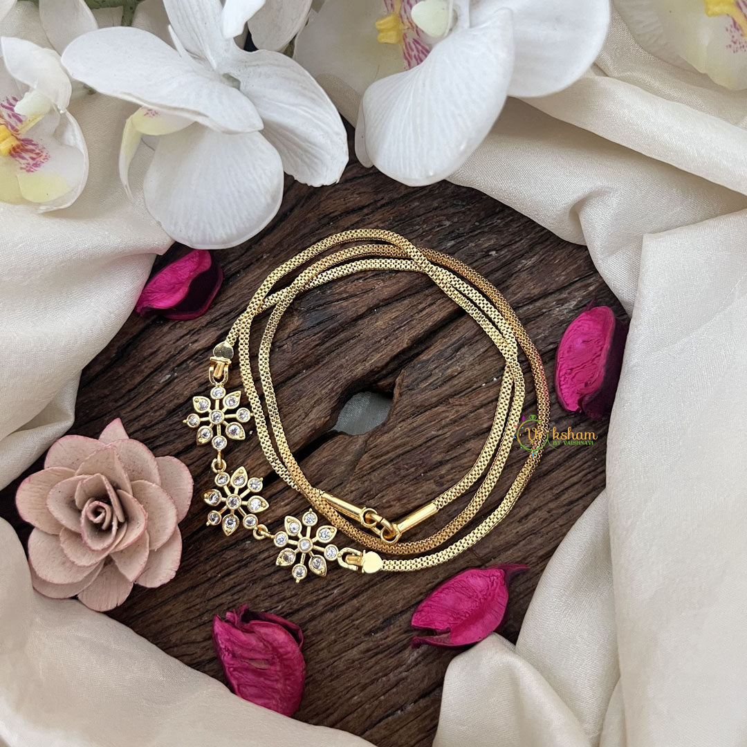 The Vriksham Floral Grace Moggapu Gold Chain in white embodies refined elegance with its delicate floral motifs and vibrant color accents. Crafted to enhance your sophisticated style, this graceful piece adds a timeless charm to any outfit, making it a perfect accessory for both special occasions and everyday wear.