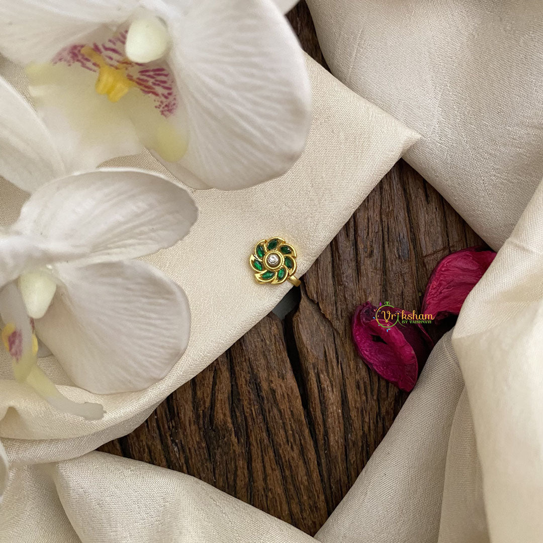Elevate your look with the exquisite craftsmanship of the Vriksham Floral Green Jadau Kundan Stone Nath/Nose pin. Featuring delicate floral designs and precious Kundan stones, this elegant piece adds a touch of sophistication to your ensemble. Make a statement and embrace luxury with every wear.