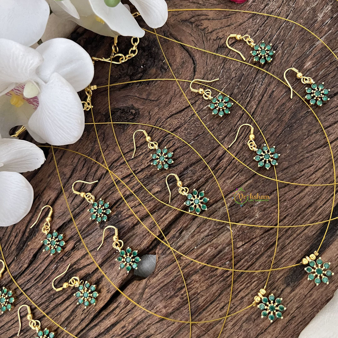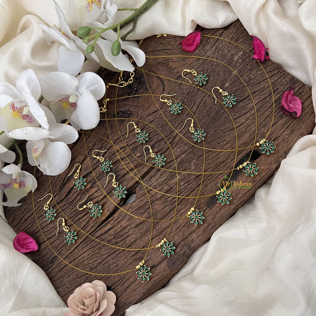 The Vriksham Floral Green Stone Invisible Pendant Chain set includes six delicate chains, each featuring an elegant floral design embellished with sparkling green stones. Crafted in an invisible pendant style, this sophisticated collection offers a subtle yet refined accessory perfect for gifting. Its timeless beauty adds a graceful accent to any outfit, making it an ideal return gift.