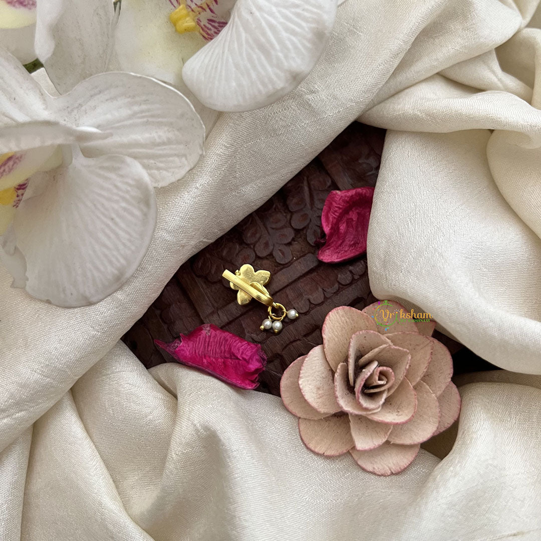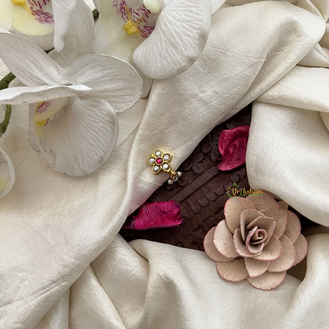 The Vriksham Floral Jadau Kundan Nath adorned with pearls in white and red beautifully merges intricate floral patterns with the elegance of lustrous pearls. This sophisticated piece showcases masterful Jadau and Kundan craftsmanship, making it an exquisite accessory to elevate your traditional ensemble with timeless grace.
