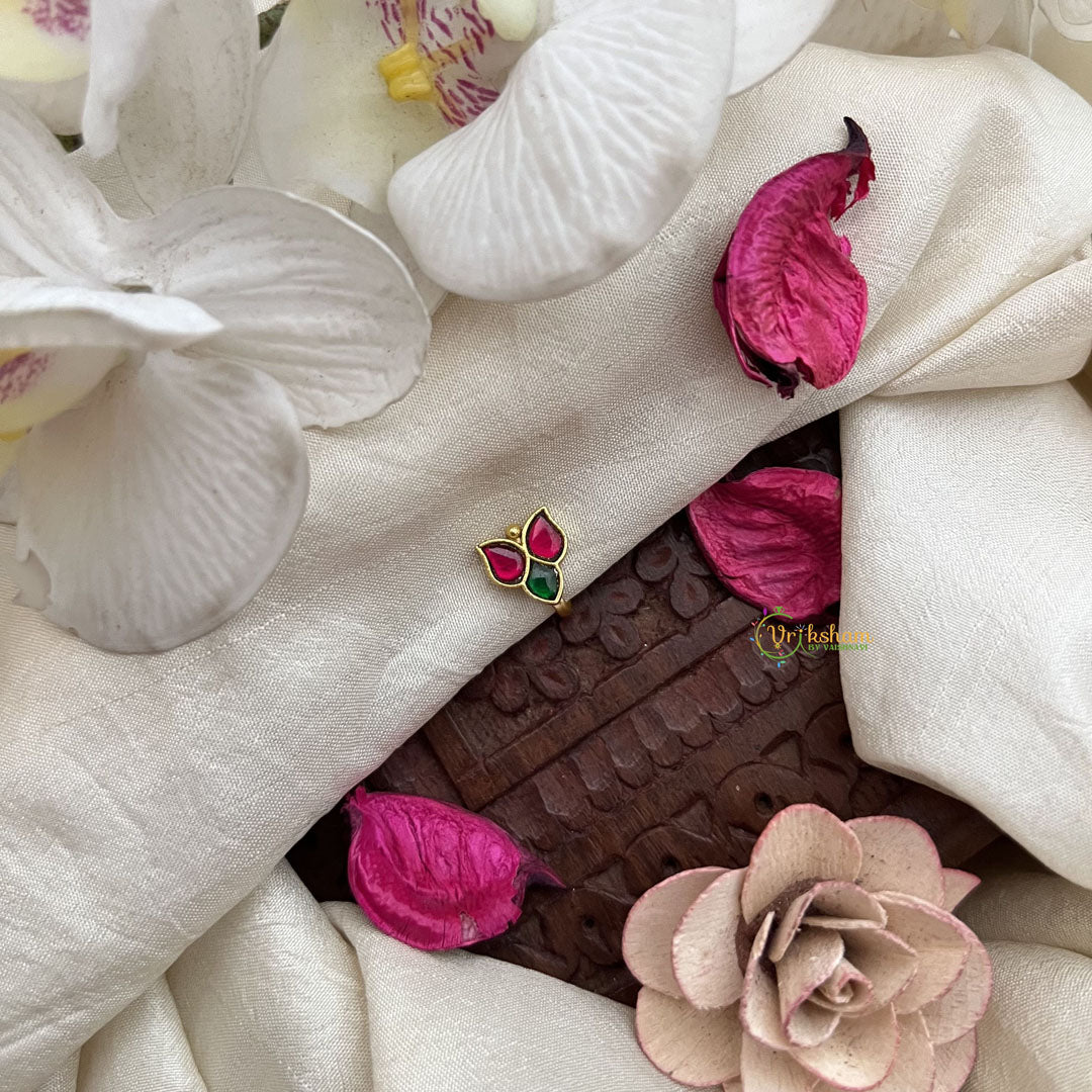 The Vriksham Floral Jadau Kundan Nath in red and green features an elegant floral design crafted with intricate Kundan work. This sophisticated nose ring adds a delicate yet striking touch to your look, perfect for enhancing your ensemble with timeless beauty and cultural elegance.