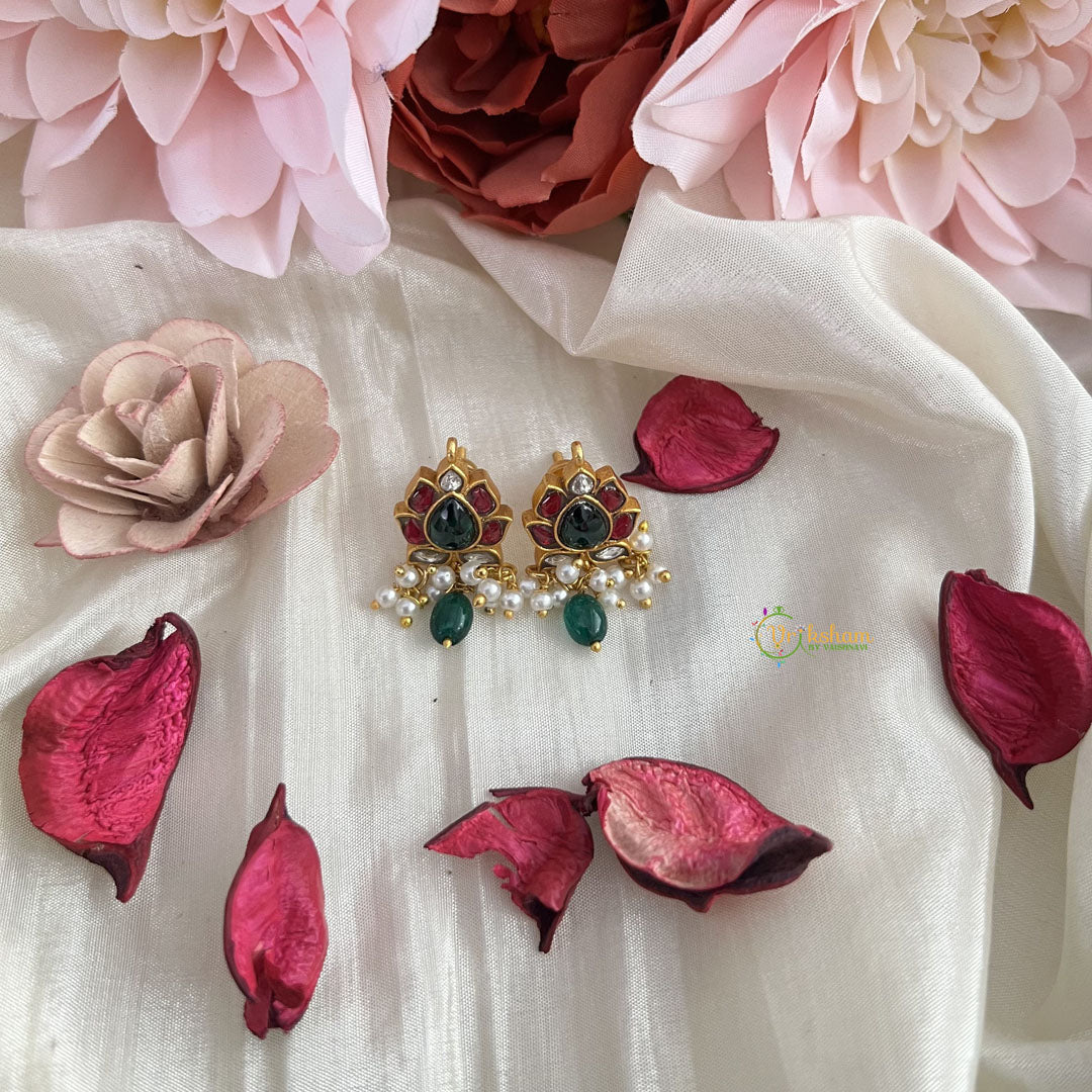Experience the refined opulence of Vriksham's Floral Jadau Kundan Stud Earrings. These distinguished ornaments showcase the timeless artistry of traditional Jadau Kundan craftsmanship, featuring an exquisite floral motif rendered in a harmonious palette of rich red, verdant green, and pristine white. The composition is thoughtfully enhanced with subtle aqua green bead accents that add dimensional depth. Meticulously crafted for the discerning connoisseur, these earrings offer a sophisticated statement that elevates both heritage ensembles and contemporary attire with understated elegance.