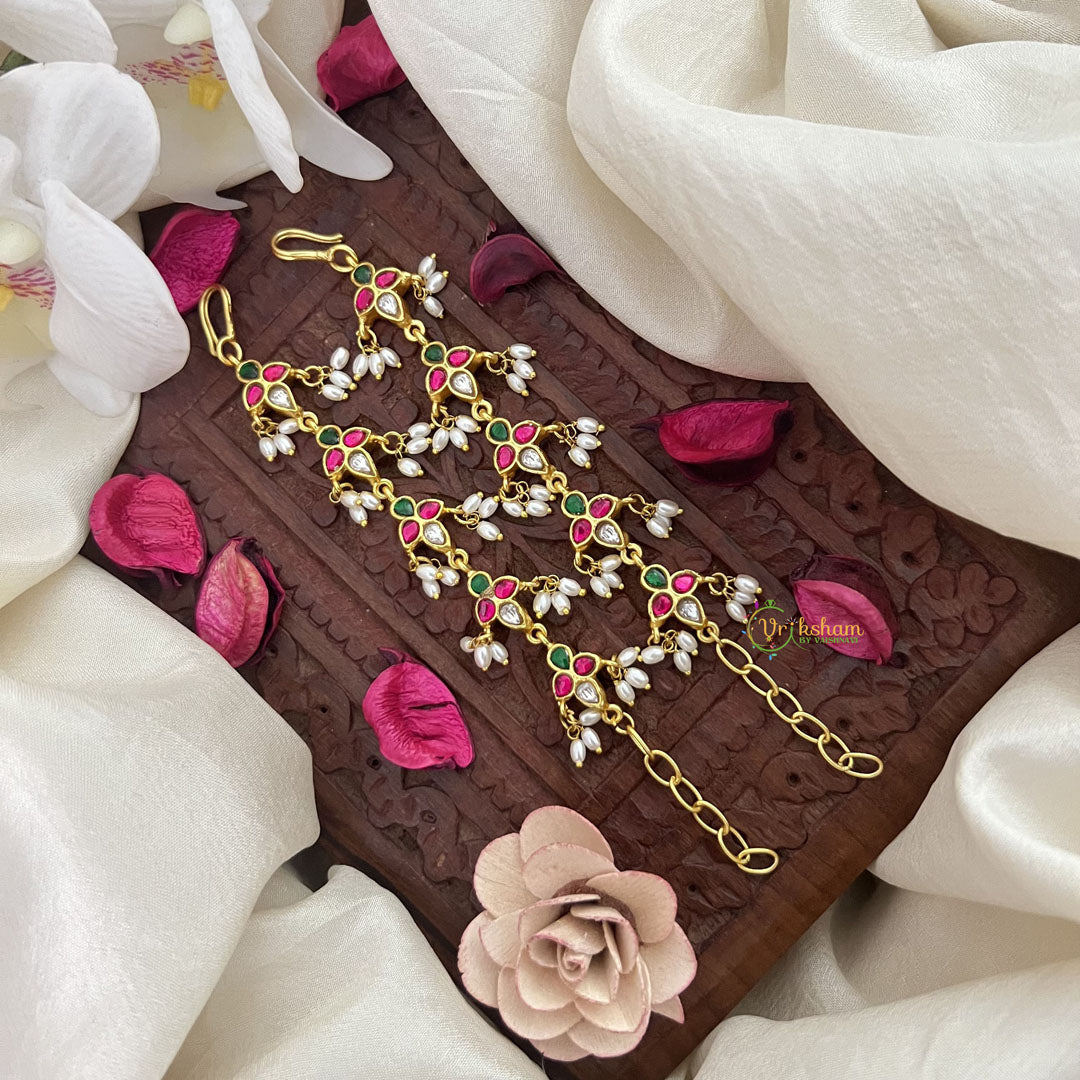 Elevate your elegance with the Vriksham Floral Kundan Jadau Single Strand Maatil. Featuring a harmonious blend of red, green, and white hues, this exquisite piece is adorned with delicate rice pearls that enhance its timeless charm. Perfect for special occasions, it offers a refined statement of traditional artistry combined with sophisticated design.