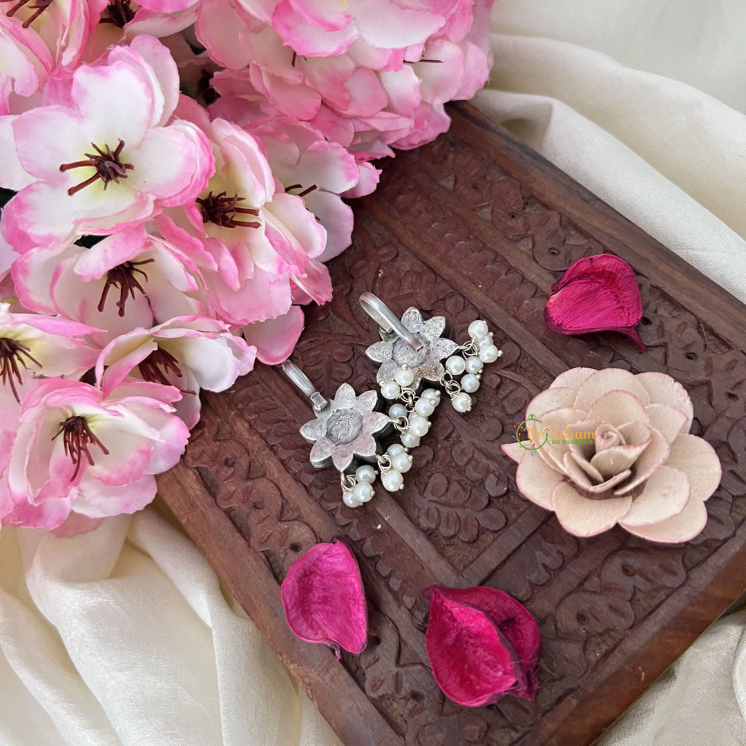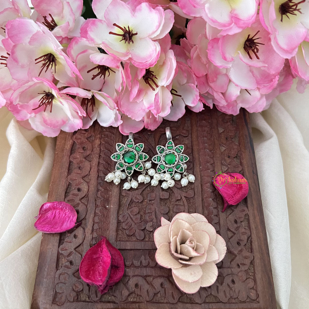 Indulge in cultural sophistication with our Floral Maharashtrian Style Press Bugadi. This refined ear ornament showcases an elegant floral motif enhanced by the striking contrast of passionate green and pristine white beads.
