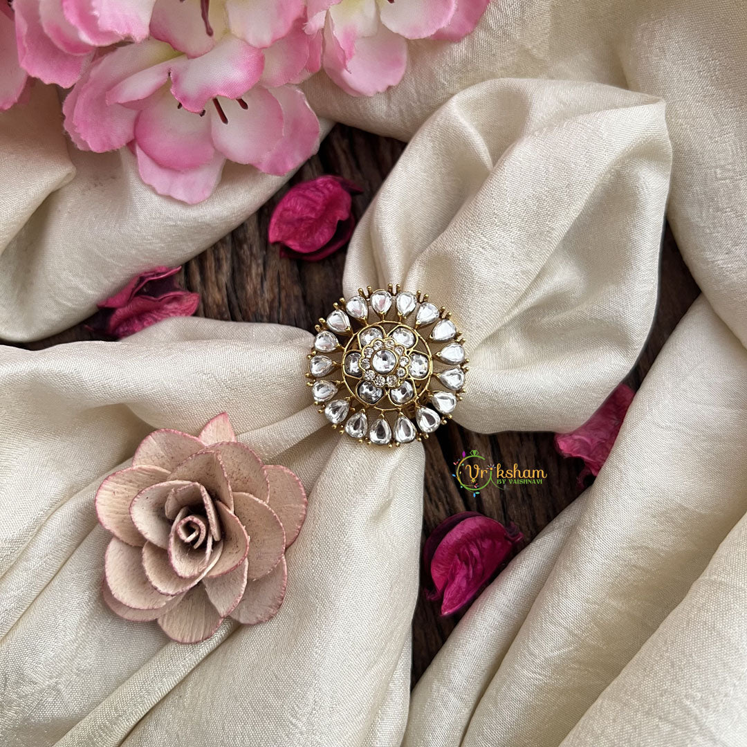 The Vriksham Floral Mossanite Tilak Shape Stone Finger Ring artfully combines a unique tilak-shaped mossanite stone with delicate floral detailing. This sophisticated piece offers a harmonious blend of cultural symbolism and refined elegance, perfect for elevating any distinguished ensemble.