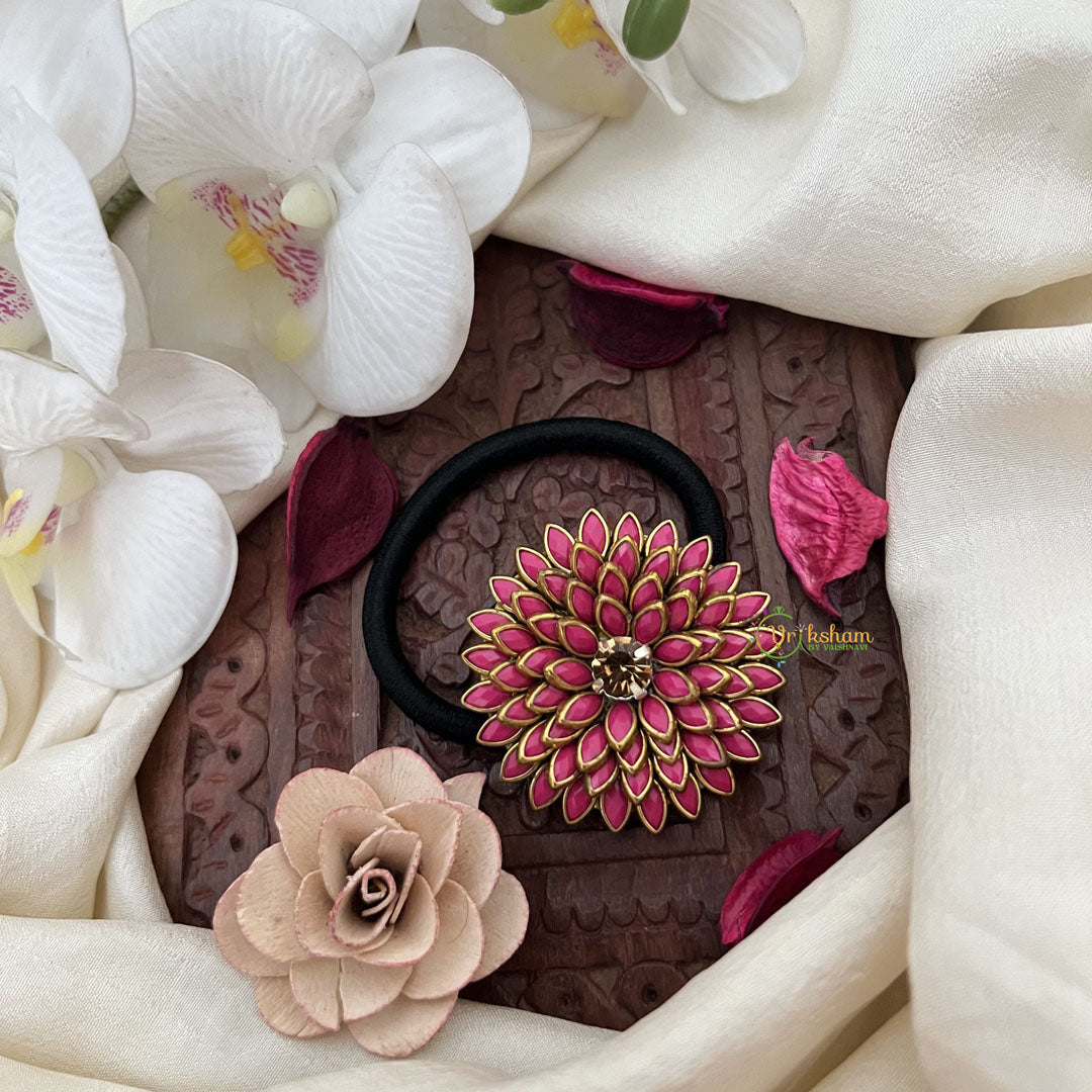 Elevate your everyday style with our Vriksham floral pendant rubber band in pretty pink. The intricate floral design adds a touch of sophistication to your hair, while the durable rubber band ensures a secure hold. Let this elegant accessory be the highlight of your outfit.
