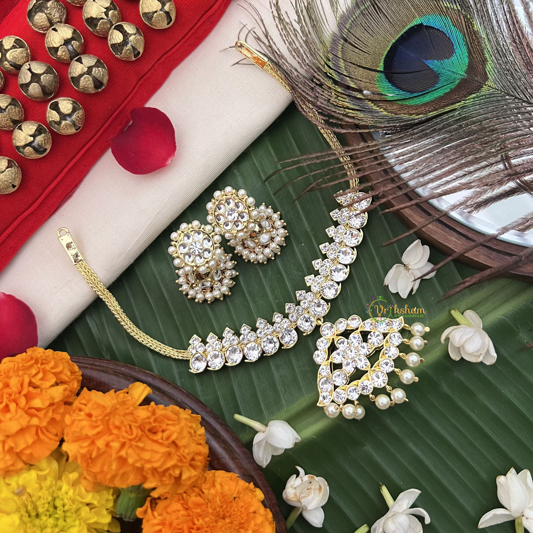 The Vriksham Floral Pendant White Crystal Temple Choker Neckpiece with pearls features delicate floral motifs adorned with shimmering white crystals. Enhanced by a subtle pearl accent, this choker exudes refined elegance and timeless beauty, making it an exquisite choice for sophisticated occasions.