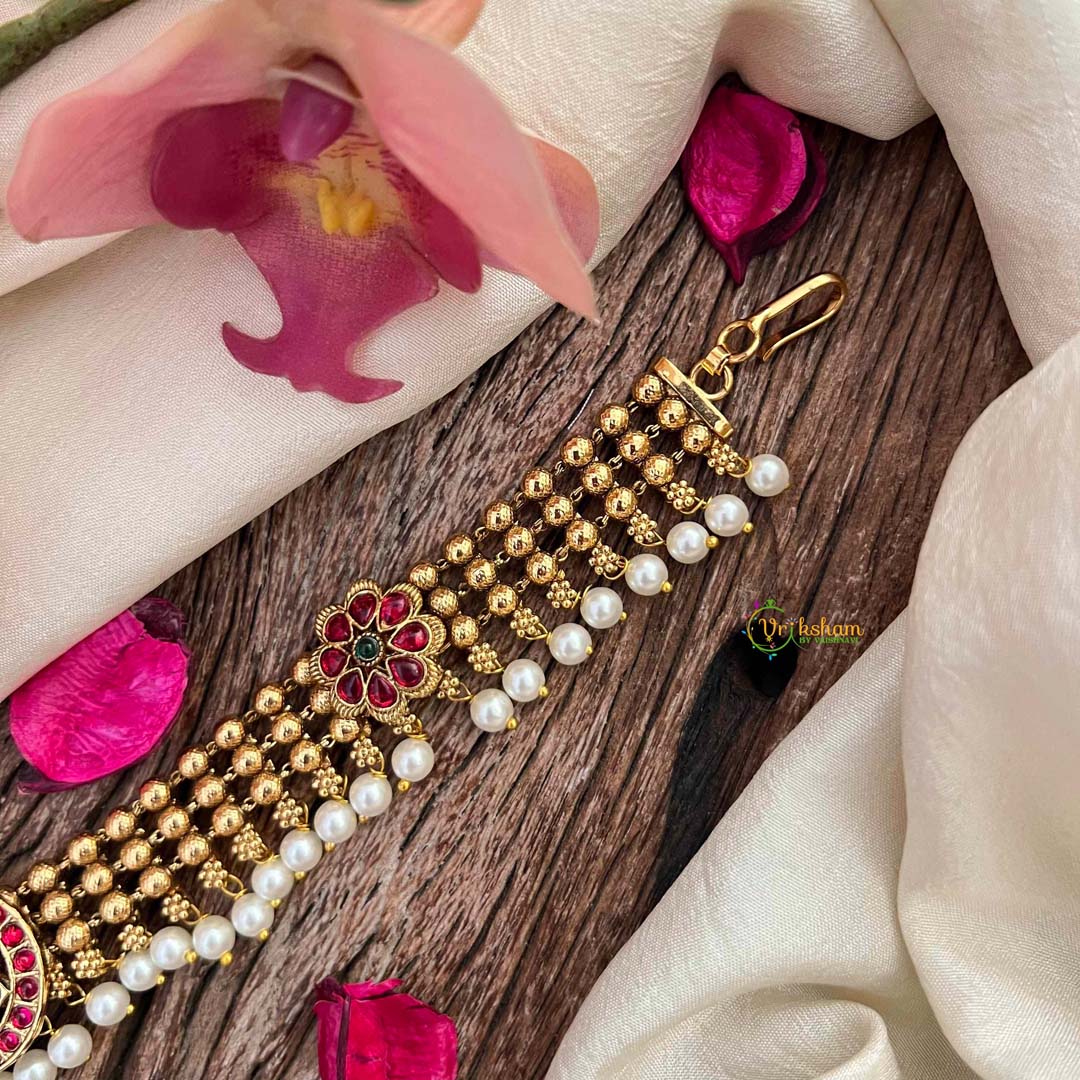 Elevate your festive ensemble with this stunning sheeshphool featuring a delicate floral design embellished with rich red and green stones. The three-layered gold bead chain construction offers graceful movement and dimension, while lustrous pearls add refined elegance to every wear. Meticulously crafted with traditional Indian jewelry artistry, this piece seamlessly blends ornamental beauty with contemporary style. Ideal for weddings, celebrations, and special occasions, it serves as a timeless accessory that honors heritage craftsmanship while making a sophisticated statement.