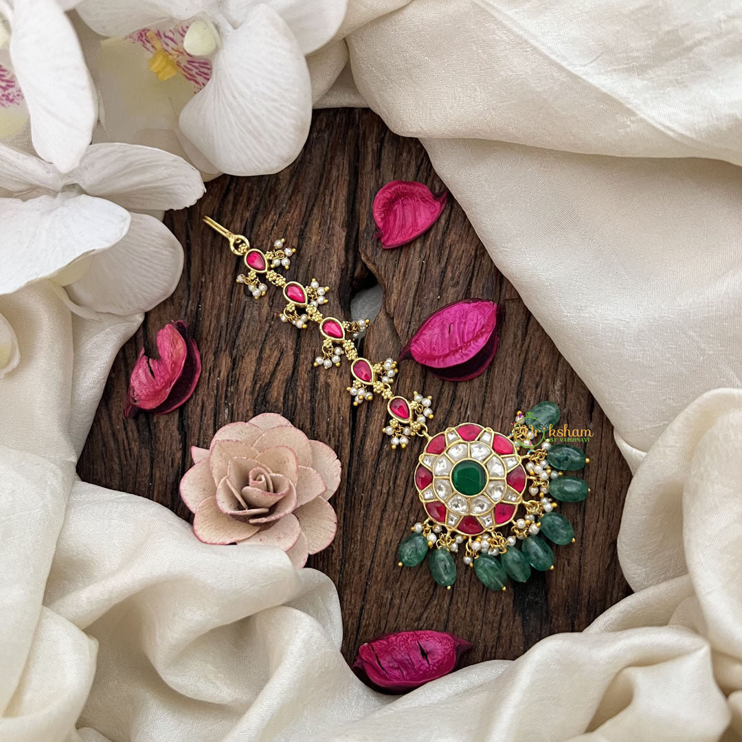 The Vriksham Floral Round Kundan Jadau Maang Tikka features a delicate floral design embellished with green beads and traditional Kundan Jadau work. This sophisticated accessory adds a graceful and timeless charm to your ensemble, perfect for enhancing your look at weddings and special occasions.