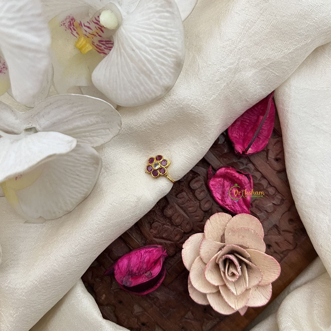 The Vriksham Floral Sparkle Nose Pin showcases a delicate floral design adorned with red and white stones, creating a graceful shimmer. Its press-on style ensures comfortable, secure wear, making it an elegant accessory that enhances your natural beauty with subtle sophistication.
