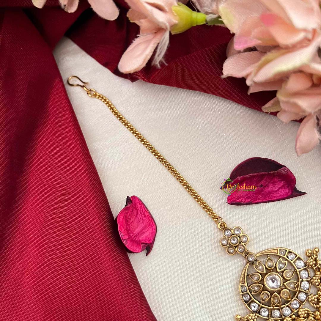 Enchant with this ethereal floral sunburst chandbali kundan jadau maang tikka, a luminous masterpiece of refined jewelry artistry. The expansive sunburst design showcases exquisite floral motifs crafted through exceptional kundan work, adorned with pristine white gemstones that radiate pure brilliance and ethereal grace. Warm golden bead accents add a touch of opulent sophistication, creating a harmonious interplay of light and luxury. This breathtaking maang tikka represents the pinnacle of classical Indian craftsmanship, making it an exceptional choice for brides seeking jewelry that honors ancestral heritage while exuding timeless elegance, radiant beauty, and unparalleled cultural significance.