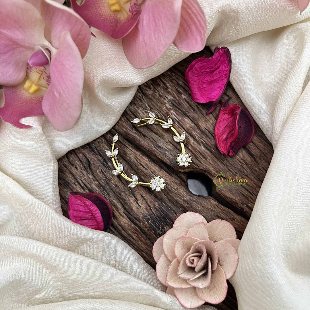 The Vriksham Floral Vine CZ Ear Climber features a light gold finish with a striking floral vine design, enhanced by sparkling cubic zirconia stones. This statement ear cuff combines elegant craftsmanship with a sophisticated silhouette, perfect for adding a graceful yet bold touch to your ensemble.