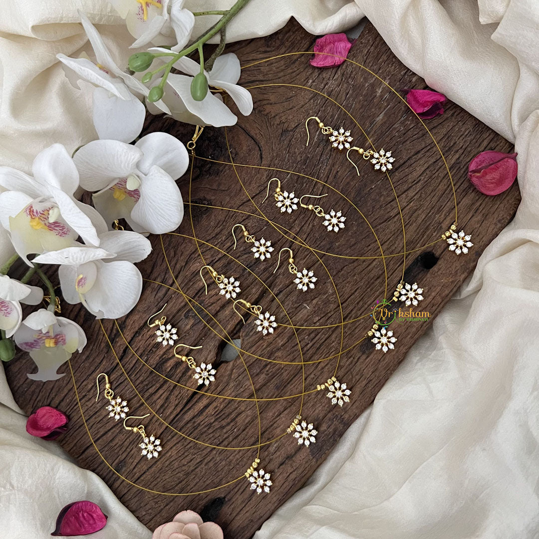 The Vriksham Floral White Stone Invisible Pendant Chain set includes six delicate chains, each featuring an elegant floral design embellished with sparkling white stones. Crafted in an invisible pendant style, this sophisticated collection offers a subtle yet refined accessory perfect for gifting. Its timeless beauty adds a graceful accent to any outfit, making it an ideal return gift.