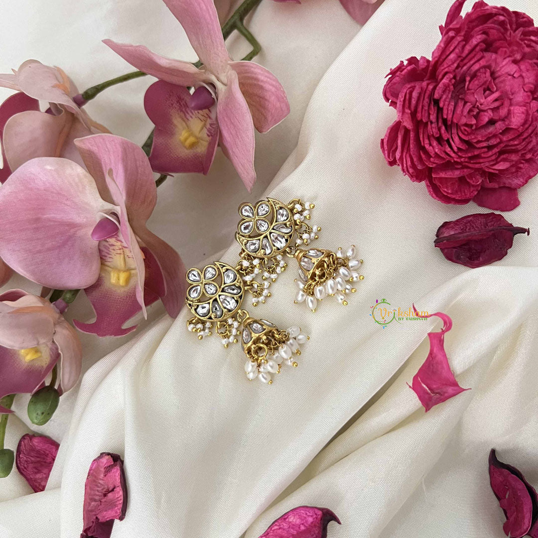 The Vriksham Floral With Half Moon Style Kundan Jadau Jhumkas showcase delicate floral motifs paired with elegant half-moon shapes, enhanced by lustrous white pearls. Expertly crafted with refined kundan work, these jhumkas add a sophisticated and timeless charm to any special occasion ensemble.