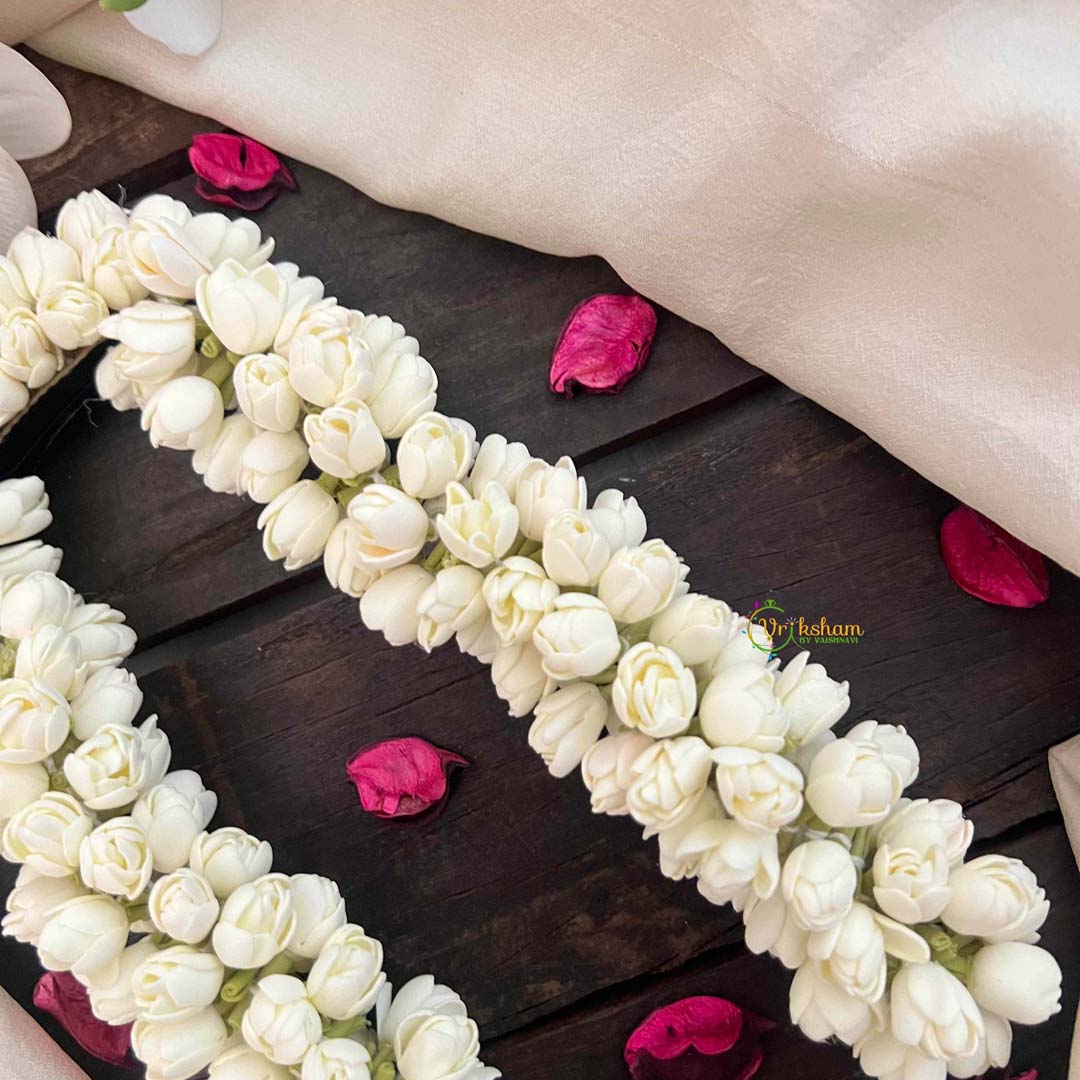 Elevate your everyday elegance with this exquisite Mallipoo Jasmine flower accessory, meticulously crafted to bring natural beauty to your hair. The delicate jasmine blooms are thoughtfully paired with a secure hair clip, offering both aesthetic charm and practical functionality. Perfect for weddings, celebrations, or adding a touch of refined sophistication to your daily look, this accessory captures the timeless allure of fresh florals. The intricate design showcases the graceful petals of jasmine, creating a statement piece that complements any hairstyle while maintaining an air of understated luxury.