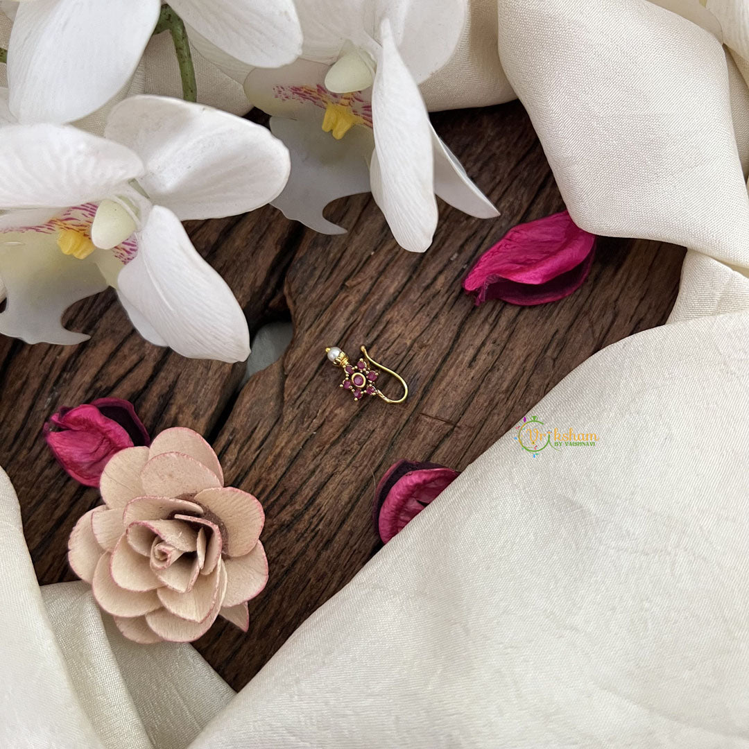 The Vriksham Flower Golden Naths in red, accented with pearls, features an exquisite floral design crafted in a rich golden finish. This elegant nose pin combines vibrant color with the subtle sophistication of pearls, adding a timeless and refined touch to traditional ensembles for special occasions.