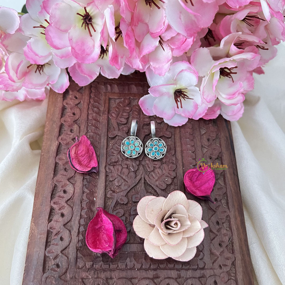 Exquisitely crafted Maharashtrian-style Press Bugadi earrings featuring delicate flower designs with firosa accents and elegant white beads. These traditional ornaments blend cultural heritage with contemporary sophistication, perfect for enhancing both festive attire and everyday ethnic ensembles.