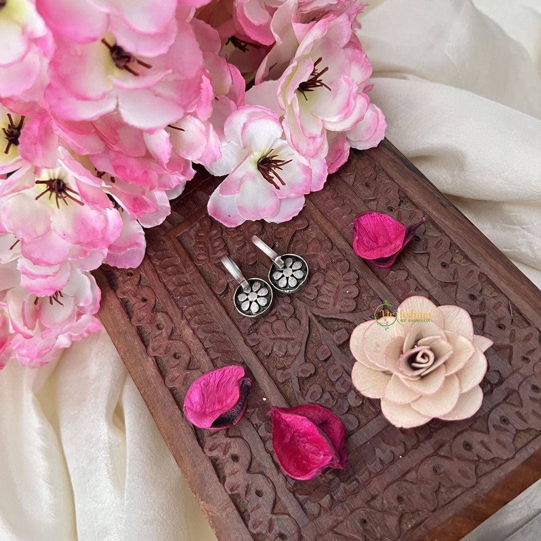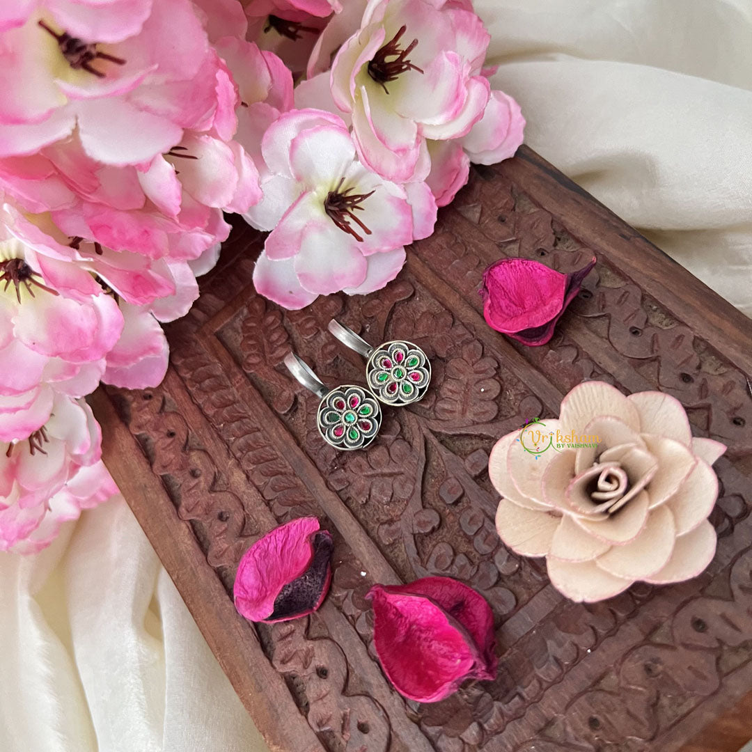 Exquisitely crafted Maharashtrian-style Press Bugadi earrings featuring delicate flower designs with red green accents and elegant white beads. These traditional ornaments blend cultural heritage with contemporary sophistication, perfect for enhancing both festive attire and everyday ethnic ensembles.