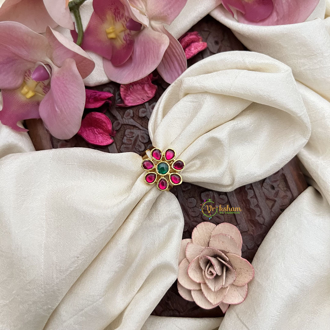Elevate your elegance with the Vriksham Flower Shape Kundan Jadau Adjustable Finger Ring in Red and Green. Expertly crafted with intricate kundan work, this statement piece features vibrant red and green accents that capture timeless beauty. Its adjustable design ensures a perfect fit, blending traditional artistry with modern comfort. Ideal for enhancing any sophisticated ensemble with a touch of regal charm.