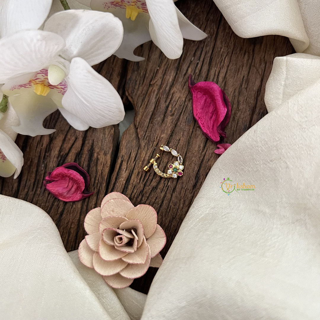 The Vriksham Flower Style Naths features a delicate blend of red, white, and green floral design, expertly crafted to harmonize traditional beauty with modern elegance. This sophisticated nose pin offers a subtle yet striking accent, perfect for enhancing your ensemble with timeless charm and refined grace.