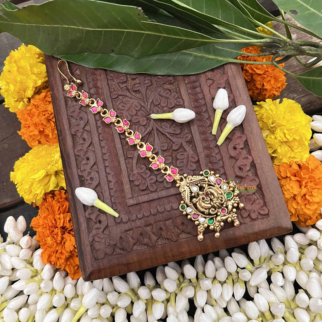 The Vriksham Fusion Style Peacock Design 1 Gram Gold Maang Tikka combines traditional peacock motifs with contemporary fusion design. Crafted with a delicate 1 gram gold finish, this lightweight accessory offers a sophisticated and elegant accent to bridal and festive hairstyles, blending timeless charm with modern flair.