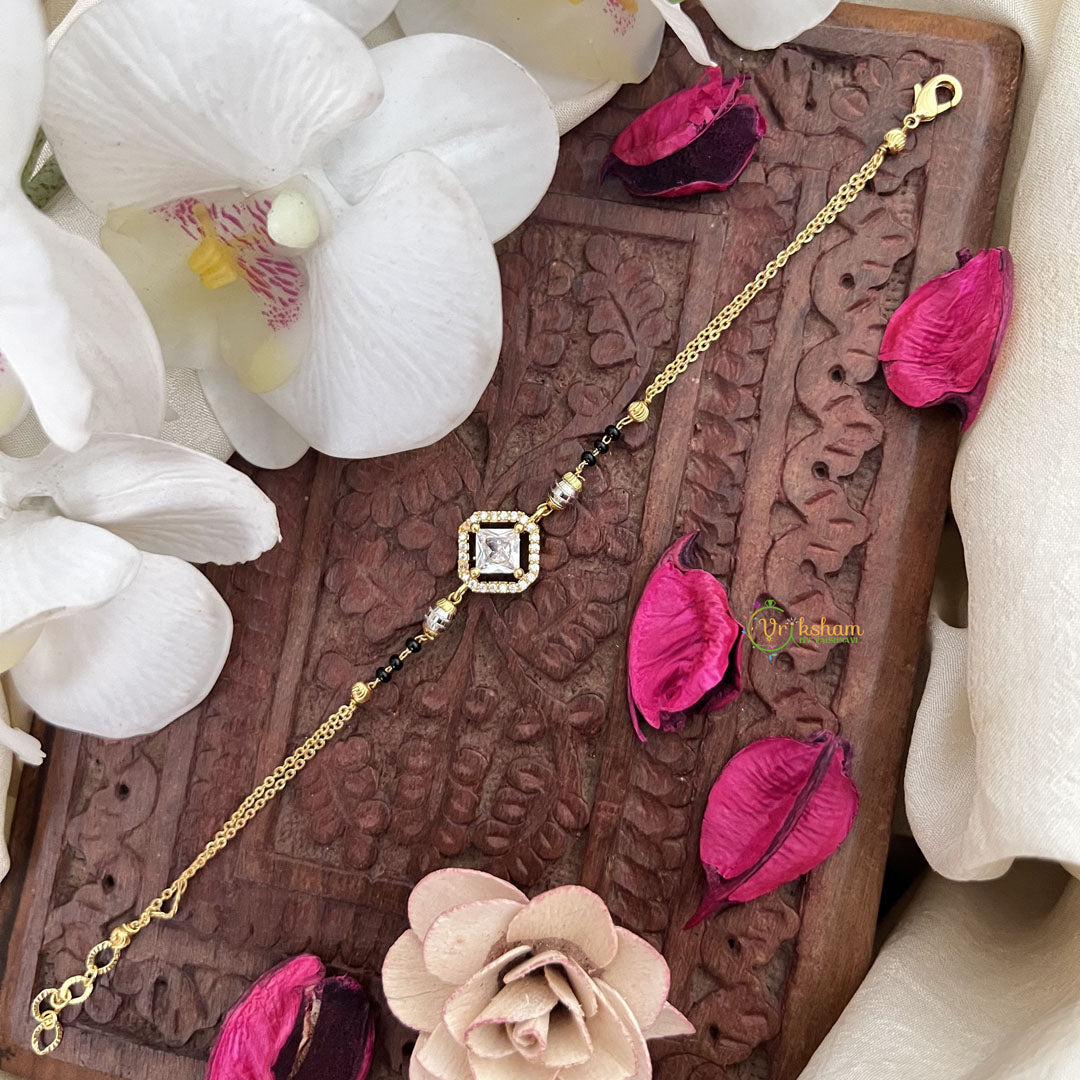 Introducing the Vriksham Ad Stone Double Square Designer Mangalsutra Bracelet, the epitome of elegance and luxury. Handcrafted with precision, this bracelet features stunning ad stone accents and a unique double square design. Complete your look with this exclusive piece, perfect for any occasion.