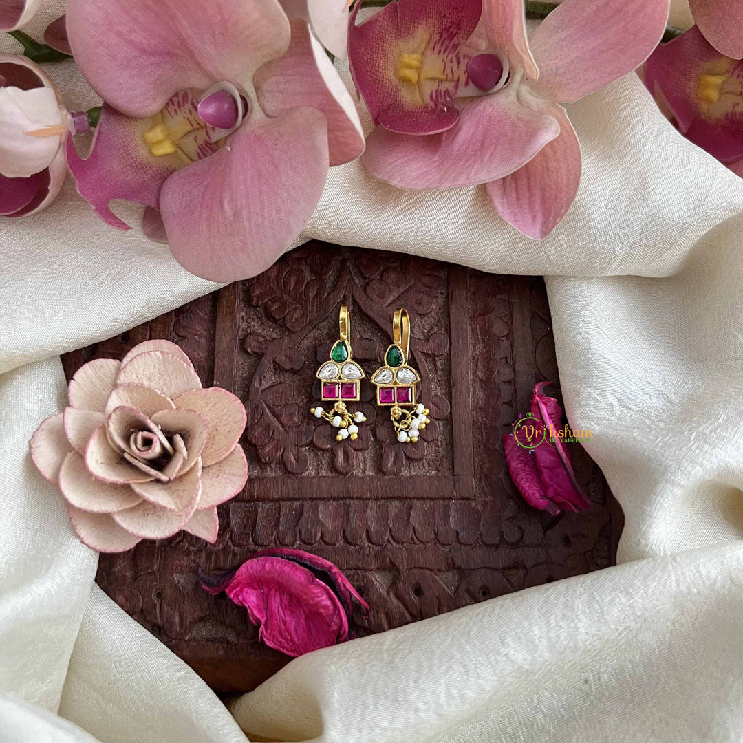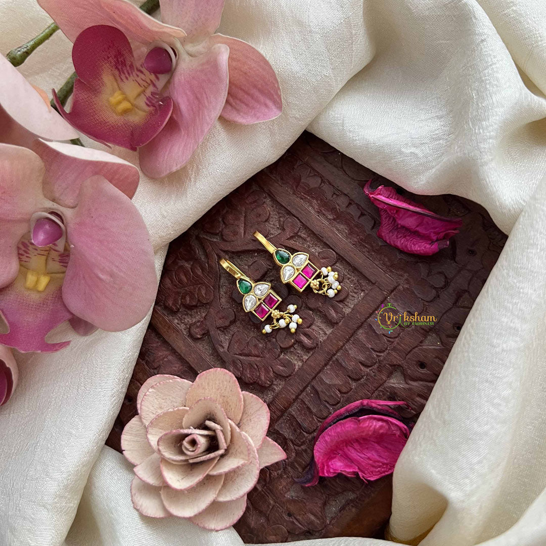 The Vriksham Geometric Teardrop Style Kundan Jadau Press Bugadi combines precise geometric design with traditional craftsmanship. Featuring vibrant red and white tones accentuated by elegant pearls, this piece offers a refined statement of style and heritage. Its unique teardrop shape enhances sophistication, making it an ideal accessory for formal occasions and elevating any outfit with timeless grace.