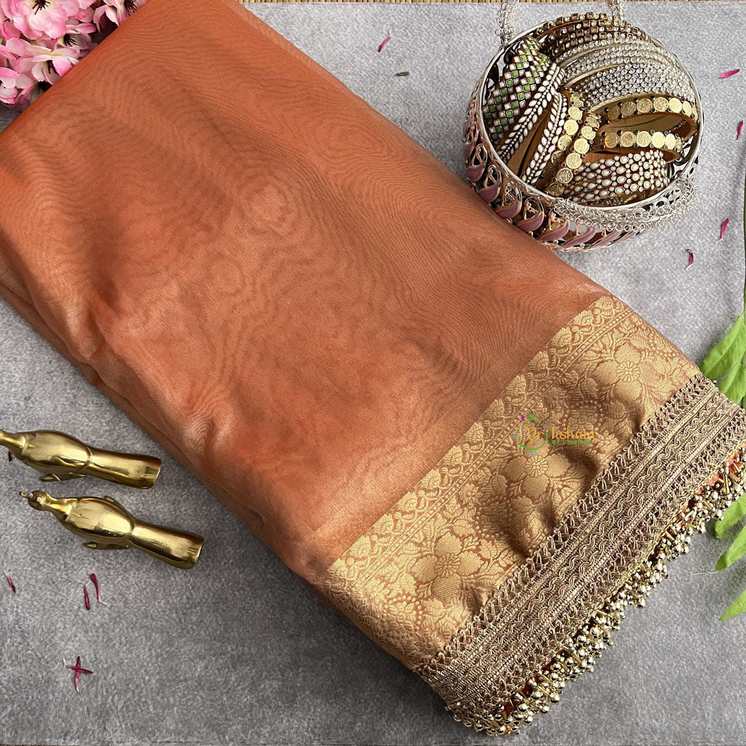 Elevate your style with the Vriksham Glossy Orange Organza Saree, adorned with intricate lace and tassel work. Handloomed to perfection, this saree exudes luxury and sophistication. Make a statement at any occasion with its rich color and elegant design. Experience the beauty of art and fashion with this premium piece.
