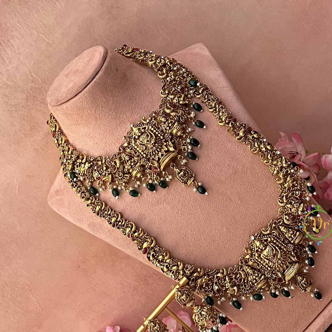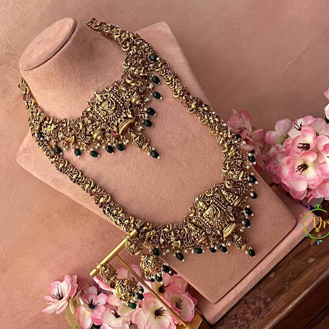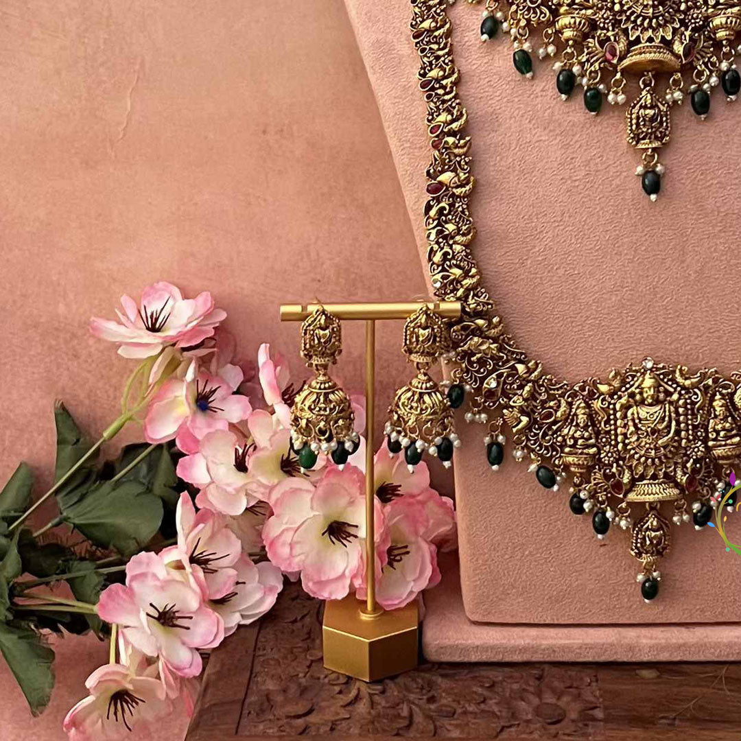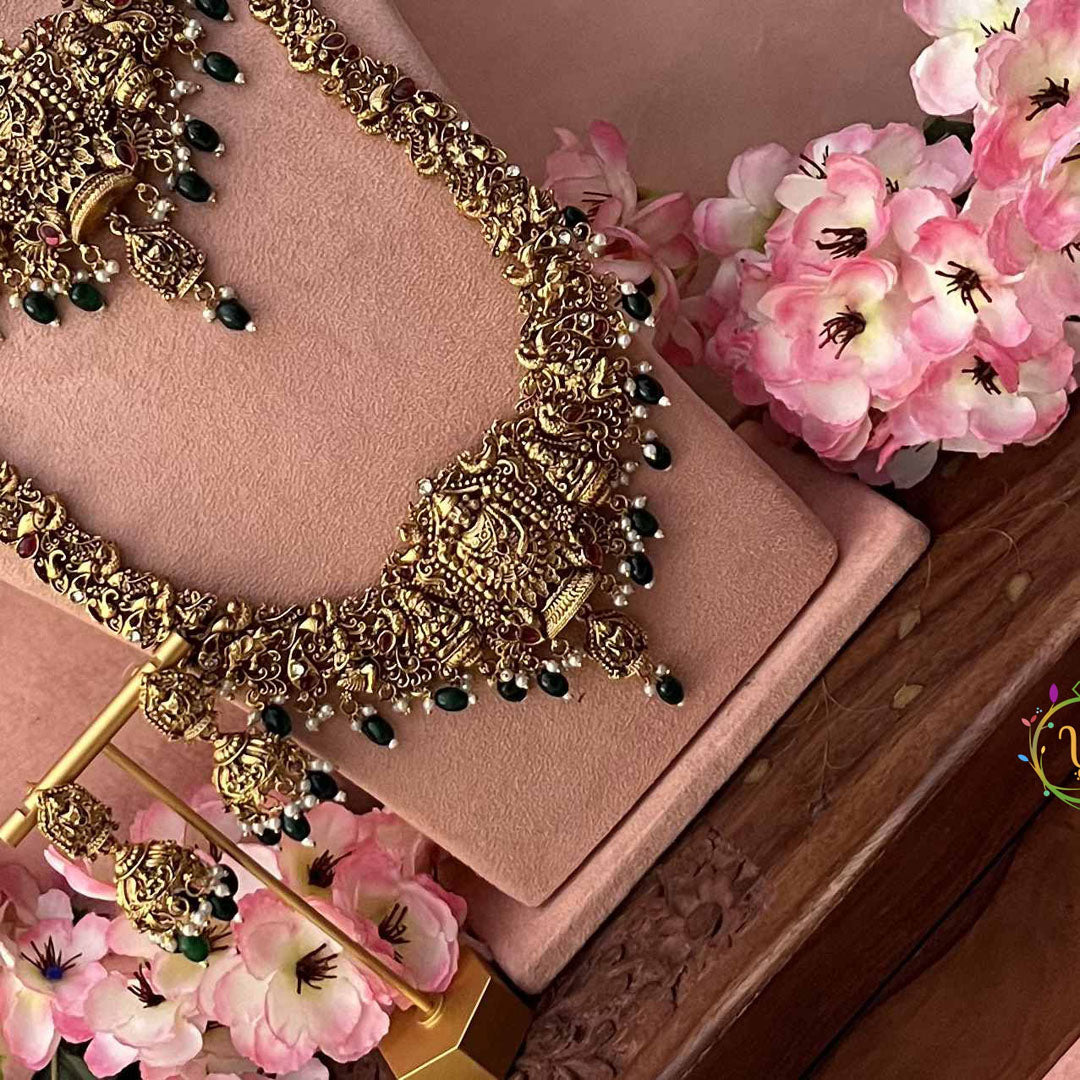 Radiate blessed elegance with this exquisite God Blessing Bridal South Indian Temple Set, a collection steeped in spiritual tradition and matrimonial grandeur. Inspired by classical South Indian temple architecture, this set features intricate designs adorned with verdant green beads symbolizing prosperity and divine favor. Each piece is meticulously crafted to honor age-old bridal customs while maintaining contemporary sophistication. Perfect for the discerning bride seeking jewelry that embodies cultural heritage and spiritual significance, this ensemble delivers timeless beauty and meaningful artistry for your most sacred celebrations.