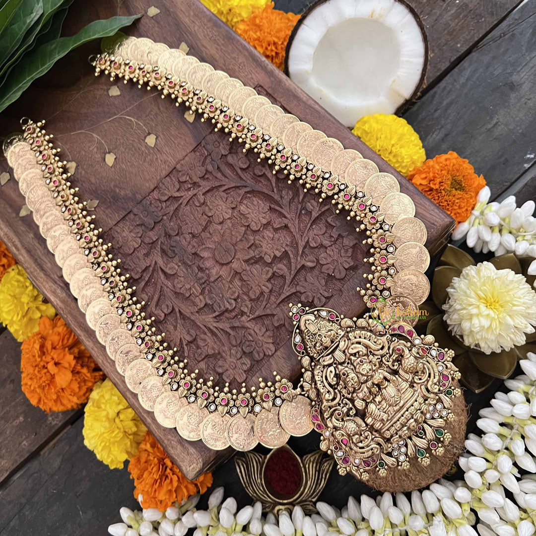 The Vriksham God Narayana Lakshmi Idol With Lakshmi Coin Style Long Neckpiece, crafted in 1 gram of gold, features detailed depictions of God Narayana alongside the iconic Lakshmi coin motif. This finely crafted piece harmonizes divine symbolism with elegant design, making it a distinguished accessory that enriches traditional attire with grace and sophistication.
