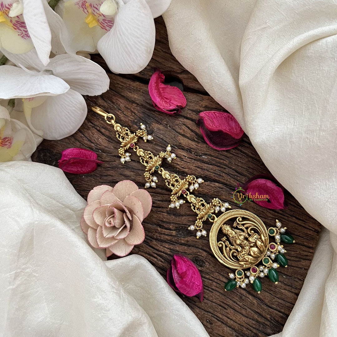 The Vriksham Goddess Lakshmi Bloom Maang Tikka with Green Beads beautifully captures the essence of prosperity and grace. Featuring delicate floral designs inspired by Goddess Lakshmi, this sophisticated piece adds a refined and auspicious touch to your traditional attire, perfect for special occasions and celebrations.