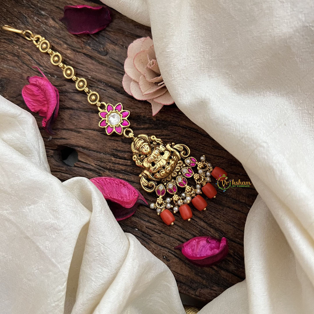 The Vriksham Goddess Lakshmi Mandala Tikka with Orange Beads features an intricate mandala design centered around the revered Goddess Lakshmi. This sophisticated accessory combines vibrant orange beads with detailed craftsmanship, adding a warm and auspicious touch to your traditional attire for special occasions.