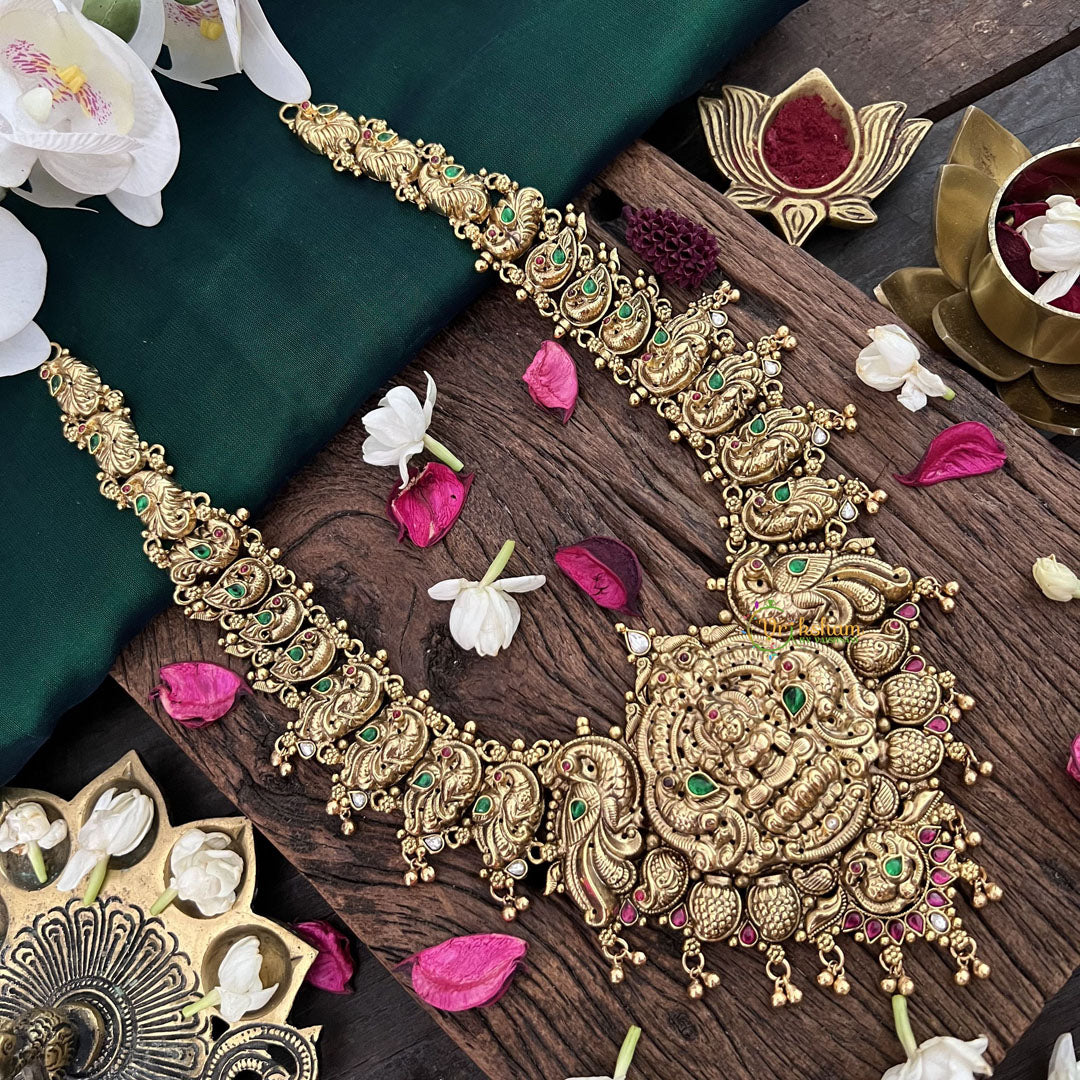 The Vriksham Goddess Lakshmi Pendant with Peacock is a finely crafted 1 gm gold haram featuring a striking green accent. This elegant piece combines traditional motifs with delicate artistry, symbolizing prosperity and grace. Its sophisticated design makes it an ideal accessory for special occasions or to elevate everyday attire with timeless charm.