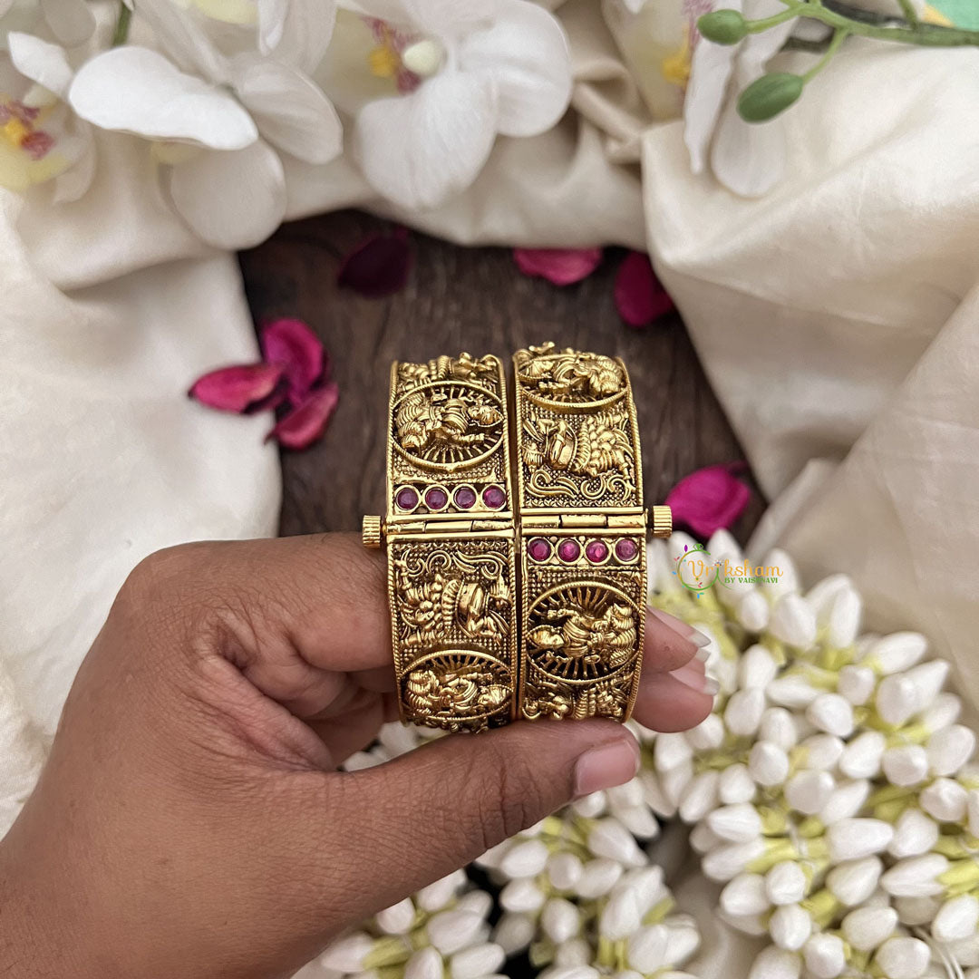Embrace timeless elegance with the Vriksham Goddess Lakshmi Temple Kada Bangles. Crafted in a rich red hue, these screw-type bangles feature intricate temple motifs celebrating Goddess Lakshmi, symbolizing prosperity and grace. Their sturdy yet refined design offers both comfort and sophistication, making them perfect for enhancing traditional and contemporary ensembles alike. Elevate your jewelry collection with a piece that reflects cultural heritage and exquisite craftsmanship.