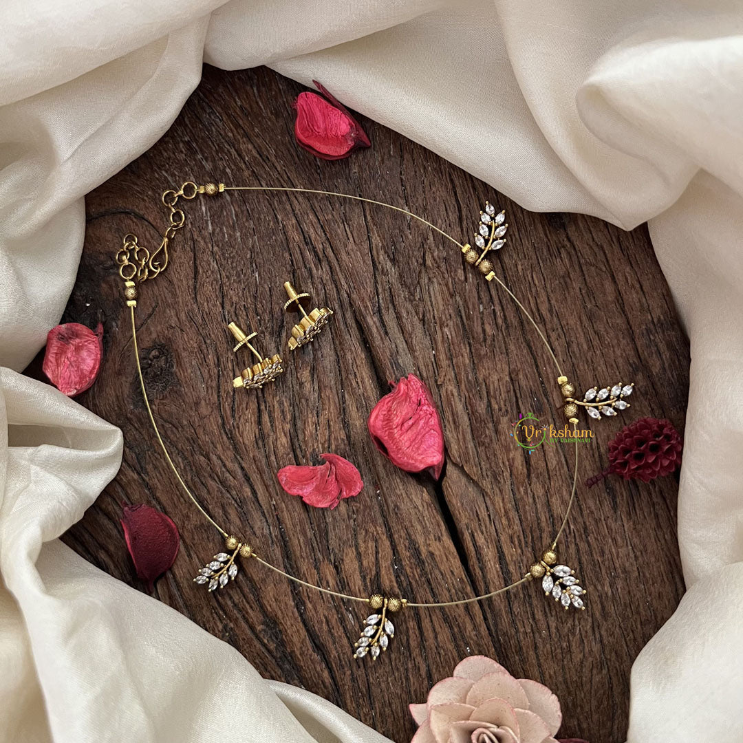 The Vriksham Gold 5 Leaf Style Invisible Neckpiece in white features a delicate design that appears to float gracefully against the skin. This sophisticated piece combines subtle elegance with refined craftsmanship, making it an ideal accessory to enhance your formal or festive attire with understated beauty and modern charm.