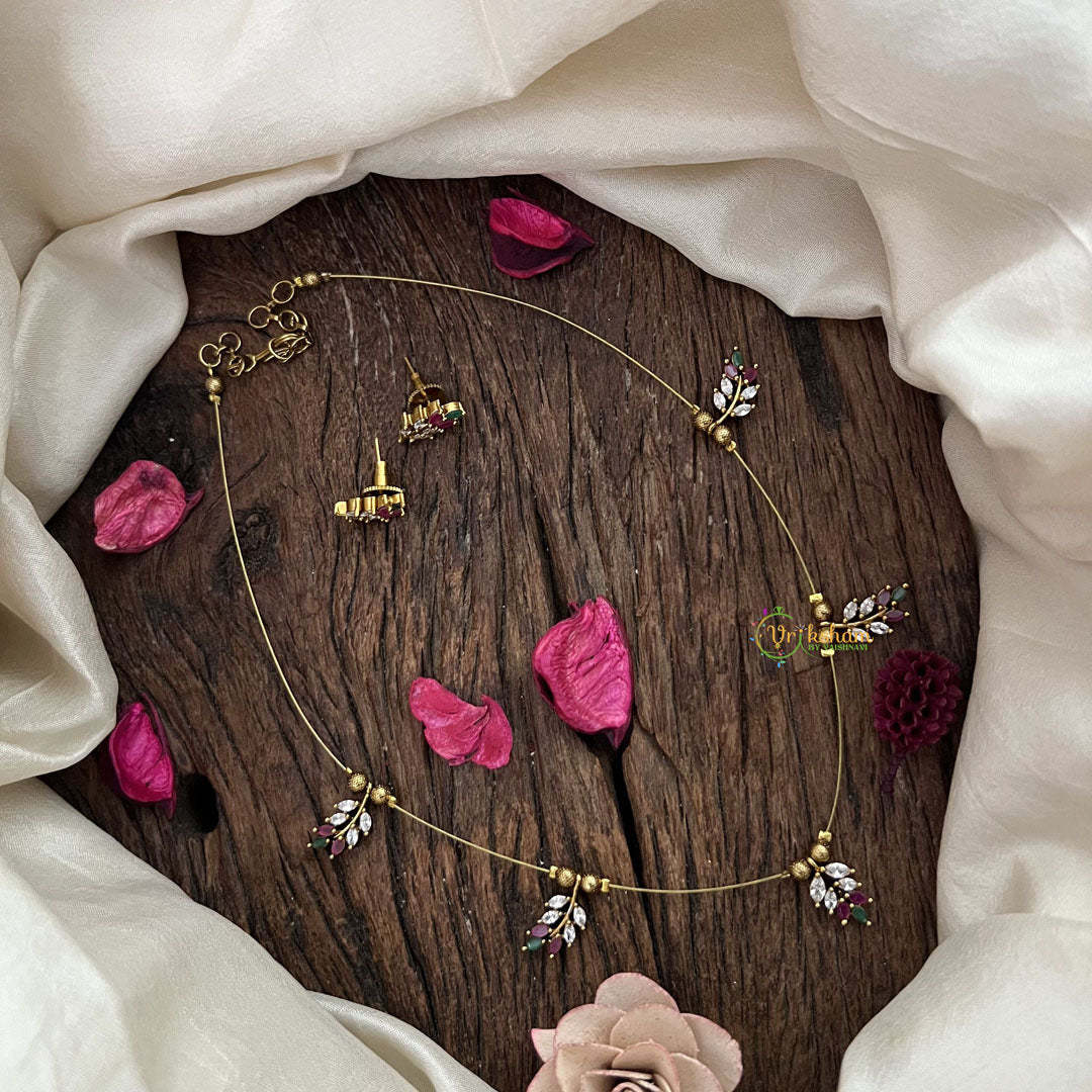 The Vriksham Gold 5 Leaf Style Invisible Neckpiece features a delicate design accented with white, red, and green elements that appear to float elegantly against the skin. This sophisticated piece combines refined craftsmanship with vibrant colors, making it a perfect accessory to enhance your festive or formal attire with subtle charm and timeless grace.