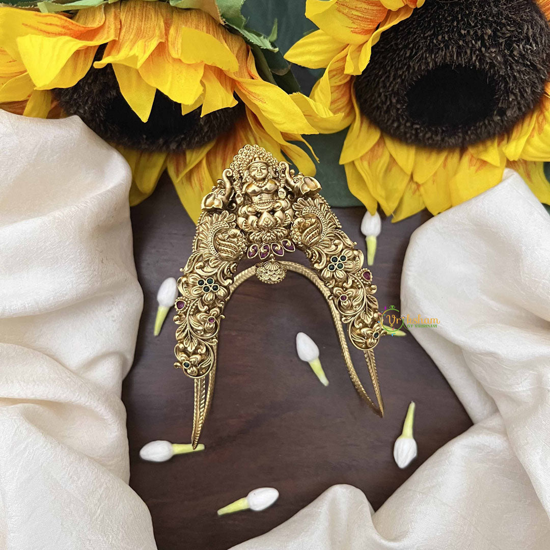 Discover the allure of these exquisite Gold Dual Peacock Lakshmi Vangis, a masterpiece of refined Indian jewelry design. Adorned with symmetrical peacock motifs in lustrous gold tones, these armlets embody prosperity and elegance. The delicate Jhumka detailing adds movement and grace, creating a harmonious blend of traditional artistry and contemporary sophistication. Perfect for weddings, festivals, and momentous celebrations, these vangis transform your wrist into a canvas of cultural splendor and timeless beauty.