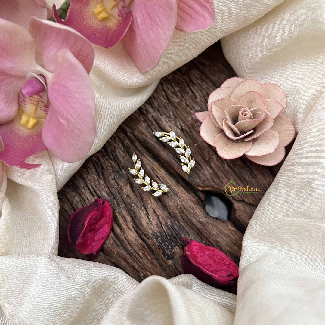 Experience subtle luxury with the Vriksham Gold Leaf CZ Ear Cuff, a minimalist crystal climber elegantly gold plated for a refined finish. Featuring delicate cubic zirconia stones arranged in a graceful leaf design, this ear cuff enhances your look with a sophisticated sparkle. Lightweight and comfortable, it is perfect for adding an effortless touch of glamour to both casual and formal outfits.