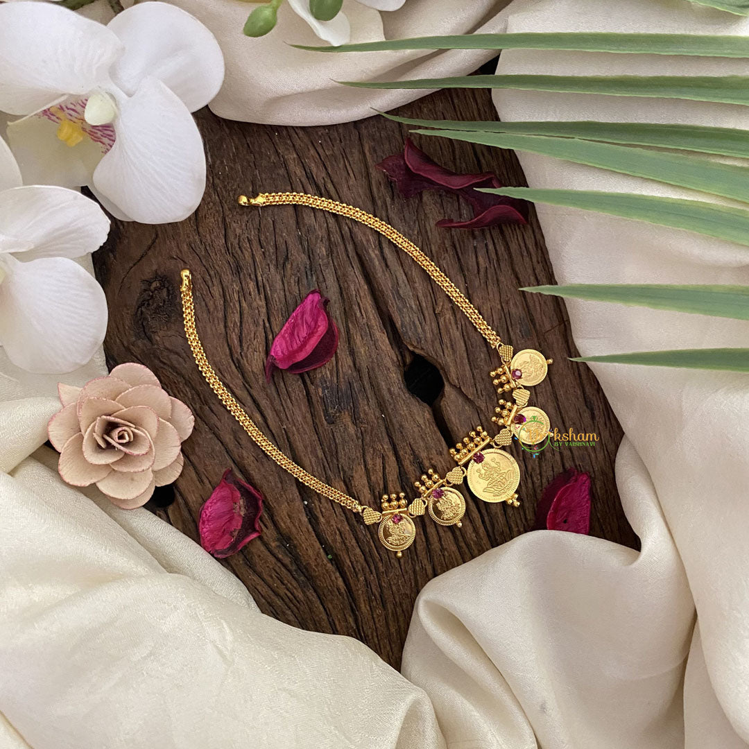 Embrace luxury and sophistication with our Vriksham Gold Look Alike 5 Lakshmi Coin Short Neckpiece. Crafted with intricate details, this exclusive design exudes elegance and grace. Elevate any outfit with this statement piece that features 5 Lakshmi coins, bringing abundance and prosperity to your life.