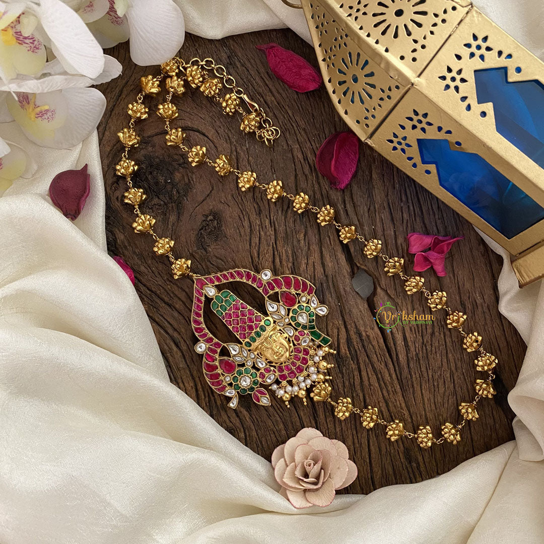 Indulge in luxury with the Vriksham Gold Look Alike Balaji Pendant Moggapu Chain. This exquisite set includes a stunning balaji pendant and matching earrings, all crafted with sophistication and elegance. Elevate your style and make a statement with this premium piece.