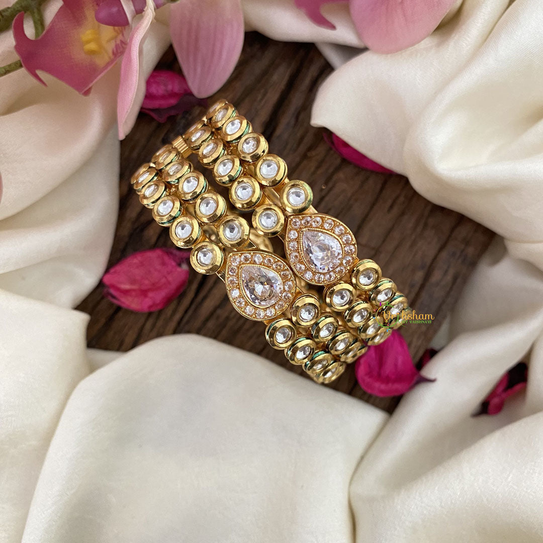 Indulge in luxury with our Vriksham Gold Look Alike Bangle-Screw Type Bangles in stunning white. With a sophisticated screw type design, these bangles effortlessly blend style and convenience. Elevate your look and make a statement with these exclusive, high-quality bangles.
