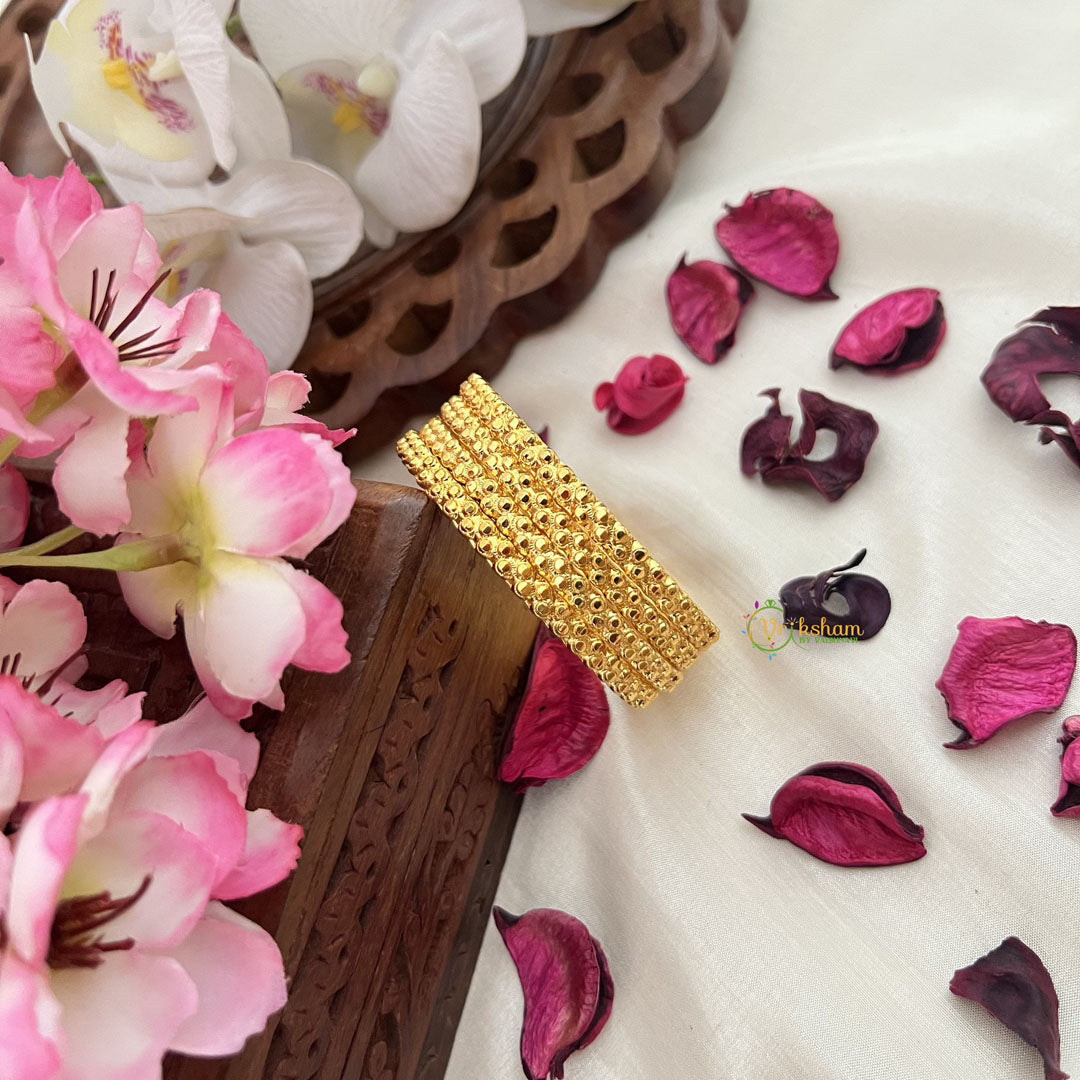 Elevate your style with our Vriksham Gold Look Alike Daily Wear Dot Design Bangle Set. Crafted with intricate dot design, these four bangles exude sophistication and elegance. Made for daily wear, these versatile bangles will elevate any outfit with their luxurious gold look. Experience the perfect blend of art and fashion with this exclusive bangle set.