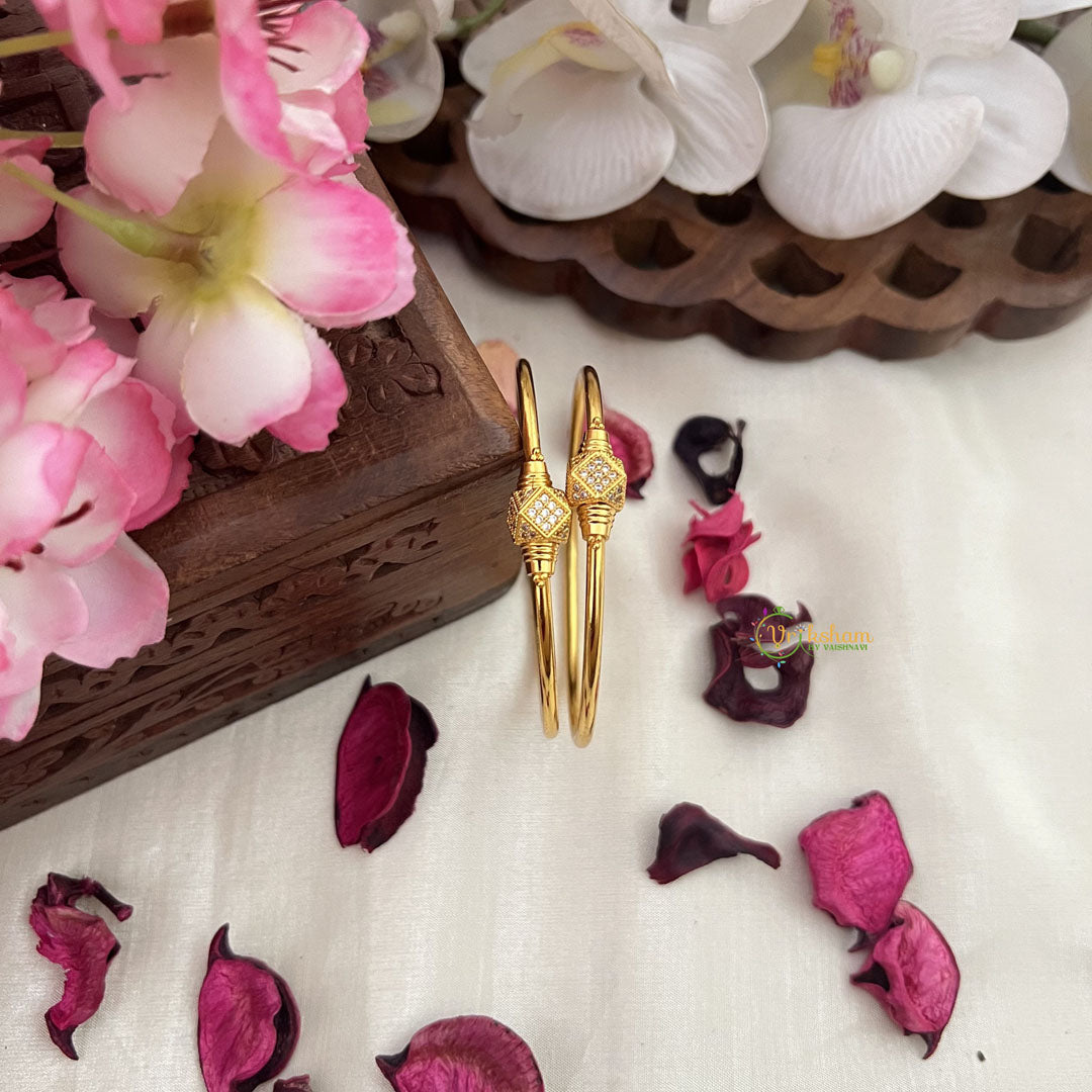 Indulge in pure elegance with Vriksham's Gold Look Alike Kada Bangles. Featuring a square design and sparkling white stones, these designer bangles exude luxury and sophistication. Perfect for daily wear, elevate your style and make a statement with these exquisite bangles.