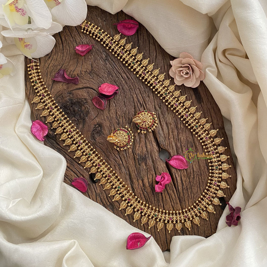 Elevate your outfit with the luxurious Vriksham Gold Look Alike Designer Long Neckpiece. The intricate design and vibrant red green color add a touch of elegance to any ensemble. Made with premium materials, this neckpiece exudes a sense of exclusivity and sophistication. Elevate yourself to the world of art and fashion with this stunning accessory.