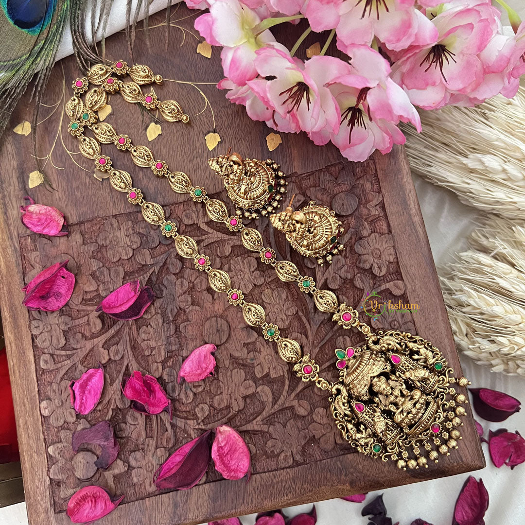 Enhance your style with our Vriksham Gold Look Alike Dual Elephant Long Neckpiece. This exclusive piece features intricate dual elephant design in stunning red hues, adorned with delicate gold beads. Perfect for adding a touch of sophistication and luxury to any outfit.