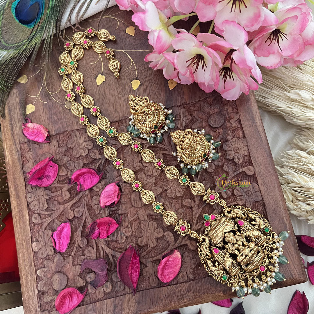 Enhance your style with our Vriksham Gold Look Alike Dual Elephant Long Neckpiece. This exclusive piece features intricate dual elephant design in stunning red and green hues, adorned with delicate pastel green beads. Perfect for adding a touch of sophistication and luxury to any outfit.
