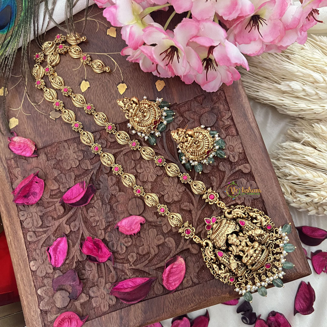 Enhance your style with our Vriksham Gold Look Alike Dual Elephant Long Neckpiece. This exclusive piece features intricate dual elephant design in stunning red hues, adorned with delicate pastel green beads. Perfect for adding a touch of sophistication and luxury to any outfit.