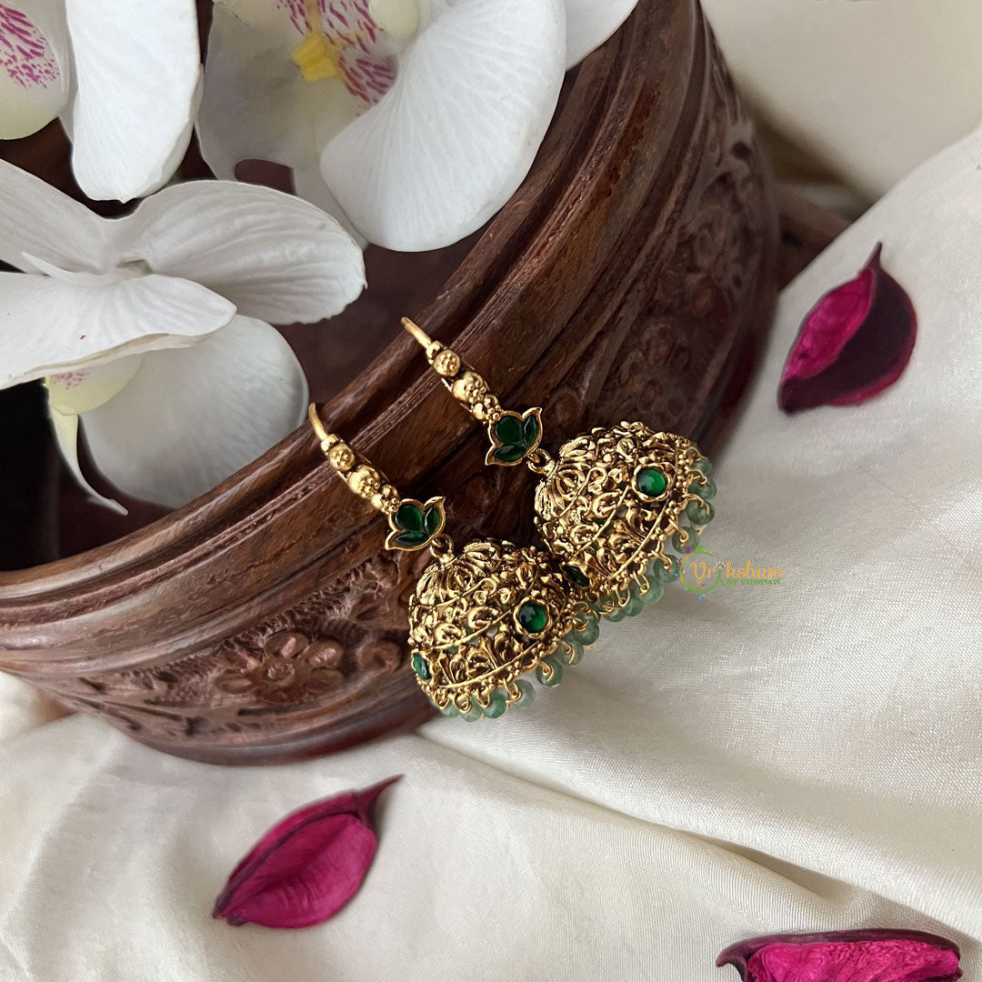 Celebrate majestic symbolism with our Vriksham Gold Look Alike Elephant Hook Jhumka. These refined earrings feature an elegant elephant motif—representing wisdom and strength—artfully suspended from a sophisticated hook design. The vibrant green elements harmonize beautifully with delicate pastel green beads, while the premium gold-tone finish creates an aura of timeless elegance. Perfect for the discerning individual seeking cultural significance transformed into a sophisticated statement piece.