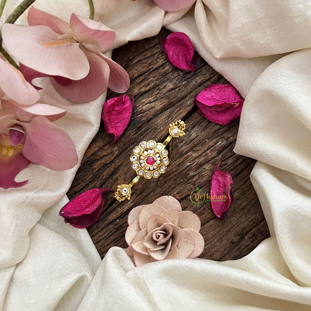 The Vriksham Gold Look Alike Floral Dual Finger Ring in Red and White features an intricate floral design gracefully spanning two fingers. Accented with vibrant red and white hues on a polished gold-look base, this sophisticated piece adds a timeless, elegant touch to any ensemble.