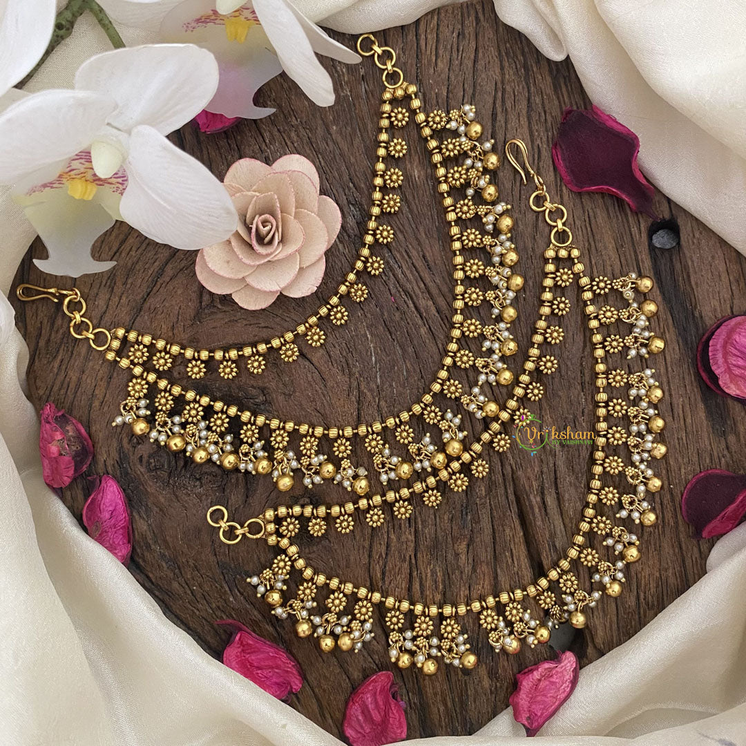 Indulge in the art of adornment with our Vriksham Gold Look Alike Floral Maatil/Ear Chain. Decorated with delicate gold tones and a vibrant pearl gold bead, this ear chain adds a touch of elegance and sophistication to any outfit. Elevate your style and embrace a luxurious feel with this exquisite piece.
